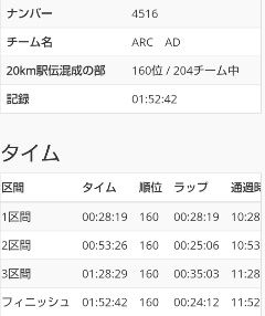 その後我々のチームは、2区の役員が約25分、3区の女性が約35分、アンカーの先輩が約24分というところで、トータル1時間52分42秒で、204チーム中160位。