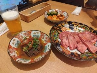 最初にキムチの盛合せとしぐれ煮のようなものが出てきて、次に牛タン。