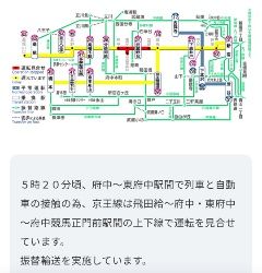 午前5時半ごろ、東府中駅と府中駅の間の踏切で車と電車が接触し、飛田給~府中駅間で運転を見合わとか。