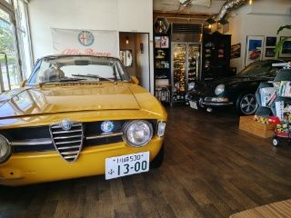 今日も余裕をもって車を停めてお店に入る。思ったほど大きな店内ではなく、その中に車が2台も置いてあるという不思議な光景。