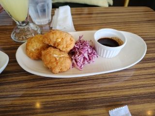 お店のおすすめは何もつけずにということで、最初はそのまま、2つ目は辛いソースをつけたが、まーぶーは辛い方が好みかも。